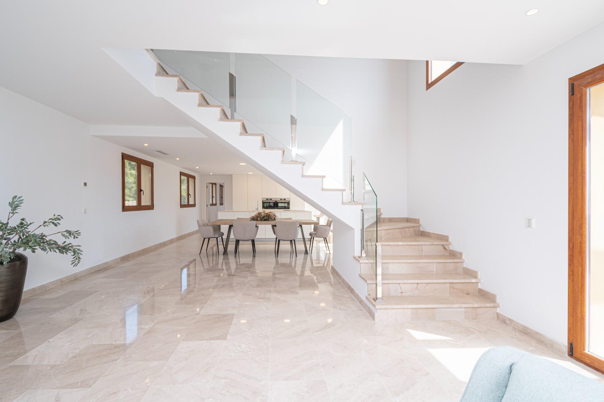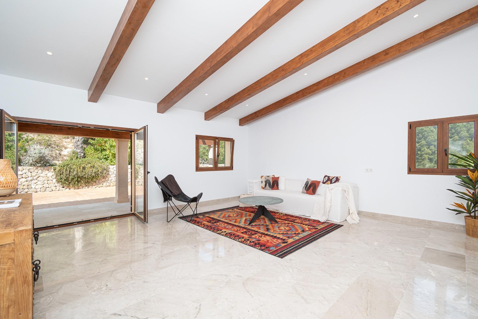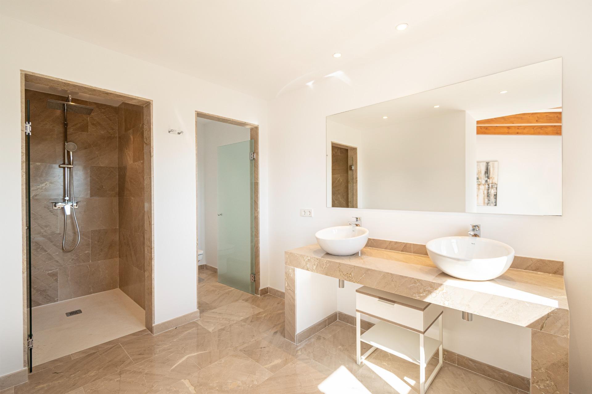 On the first floor we find a large entrance that leads to the "winter room", as we call the most intimate living room, with the possibility of installing a fireplace, a traditional cozy space in Mallorca. On this floor we also find the Guest apartment: Located to the right of the entrance, this apartment offers multiple possibilities according to the tastes and desires of the buyer. To the left of the entrance, there are two large bedrooms, each with built-in wardrobes and an en-suite bathroom, providing comfort and privacy.