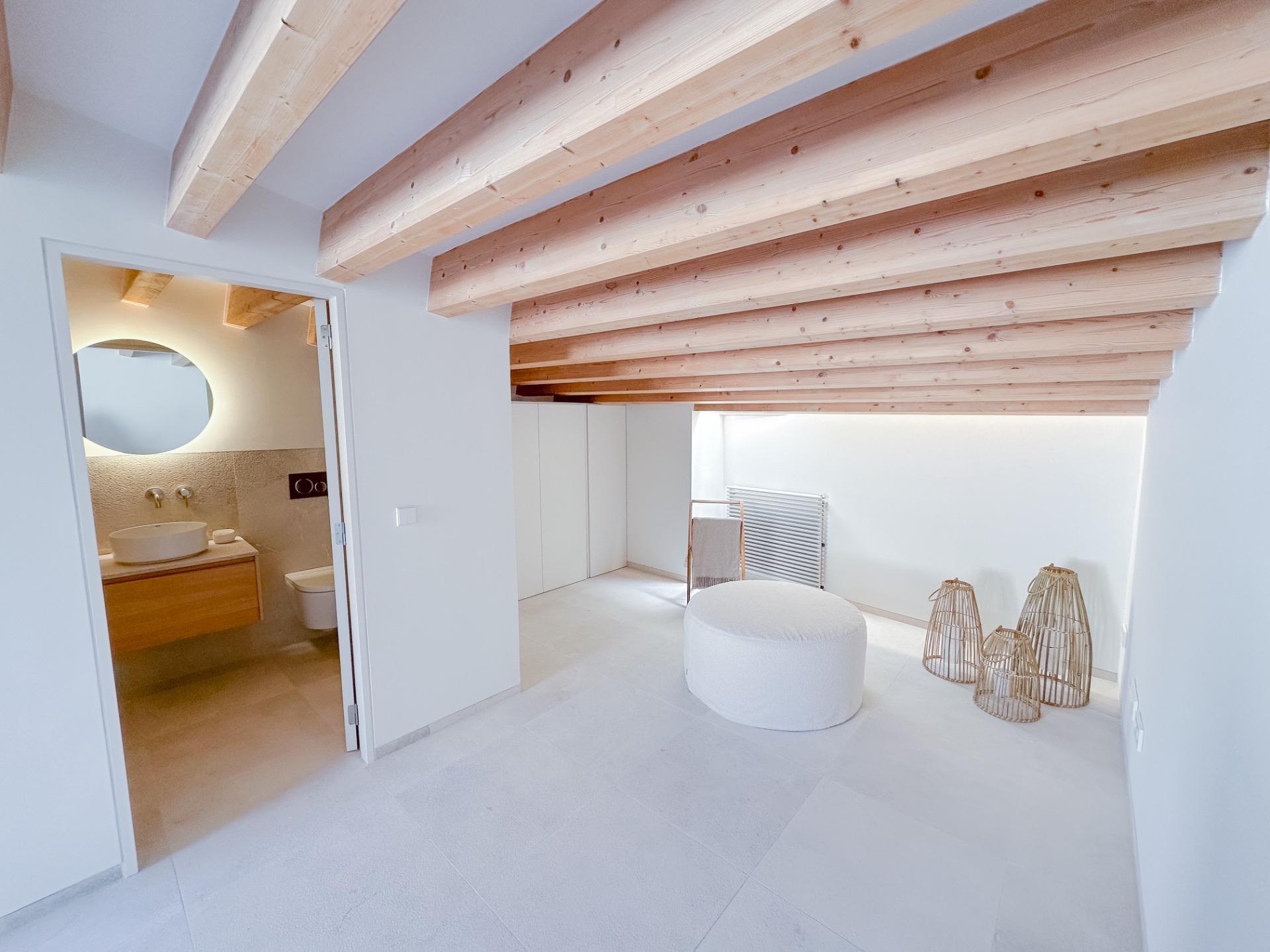 La buhardilla, con acceso a otra terraza y un aseo, es un espacio versátil: puede ser dormitorio extra, despacho, sala de lectura o rincón de juegos, siempre con vistas directas a la Serra de Tramuntana, que aportan una sensación de paz y amplitud.